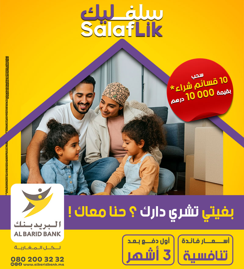 عرض خاضع لشروط، شريطة استفادتكم من قرض السكن للبريد بنك، صالح إلى غاية 31 دجنبر 2025. يتوفر المقترض على أجل 10 أيام للتفكير بقبول العرض. البريد بنك يهديكم قسيمة شراء بقيمة 000 10 درهم. سيتم إجراء سحب القرعة للإعلان عن 10 مستفيدين. تفتح باب المشاركة في هذه القرعة حصرياً أمام زبناء البنك الذين تقدموا بطلب قرض عقاري خلال الفترة الترويجية الممتدة من 20 نونبر إلى 31 دجنبر 2025، باستثناء القروض الاجتماعية FOGARIM و FOGALOGE، مع ضرورة أن يكون صرف القرض قد تم قبل 1 مارس 2026.